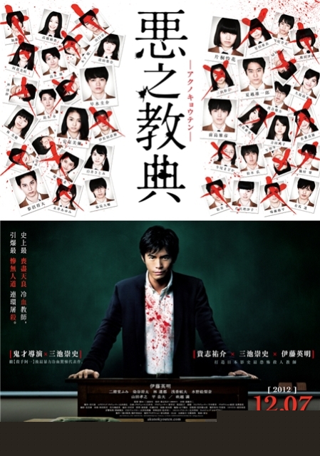 大陸譯名:惡之教典 英文片名:Lesson Of The Evil 日本上映日期:2012/11/10 台灣上映日期:2012/12/07 ※戲院時刻表 國別:日本 類型:犯罪、驚悚 導演:三池崇史(逆轉裁判) 編劇:三池崇史(日式牛仔一品鍋) 演員:伊藤英明(252生存訊號)、林遣都(東京同棲生活)、山田孝之(漂丿男子漢) 製片預算 / 全日票房:不明 / ¥1,827,717,489(4週) 日文官方網站:http://www.akunokyouten.com/ 一區DVD:尚未 三區DVD:尚未 各國原版海報:尚未 劇情簡介:改編自貴志祐介的同名驚悚小說。高校教師蓮實聖司(伊藤英明 飾演),表面上備受學生愛戴,並深得學校及家長信賴。然而誰知道,在他充滿陽光笑容與高EQ的面具底下,竟存在反社會人格障礙…。在慣看校園霸凌、考試作弊、怪獸家長、同性戀、性騷擾、援助交際等種種扭曲行為事件,他內心的陰暗面也漸次擴大,並開始構築起自己理想中的教育王國。潛藏在他內心的惡魔不斷召喚著他,此時學生竟又發現他與別校的連環殺人案件有所關聯。接踵而來的事件,讓蓮實聖司決定在校園文化祭前一晚,拿起獵槍,對全班同學展開慘絕人寰的冷血屠殺。一聲又一聲凌厲的槍響,伴隨此起彼落絕望的尖叫,學校成為地獄的血池,究竟誰能逃出魔爪…?震撼人心的驚悚結局,將讓你永生難忘!