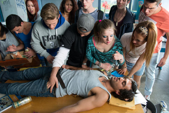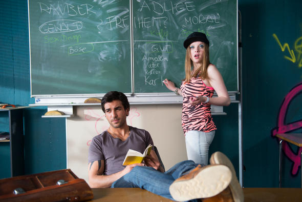 大陸譯名:該死的歌德 英文片名:Suck Me Shakespeer 德國上映日期:2013/11/07 台灣上映日期:2014/12/05 ※戲院時刻表 國別:德國 類型:喜劇 導演:Bora Dagtekin(土耳其語入門) 編劇:Bora Dagtekin(土耳其語入門) 演員:艾利亞斯穆巴瑞克 Elyas M'Barek(土耳其語入門) 製片預算 / 德國票房:不明 / 7176萬美金 英文官方網站:constantin-film.de/kino/fack-ju-goehte/ 一區DVD:尚未 三區DVD:上遠傳影城免費看【不良鮮師】 各國原版海報:尚未 劇情簡介:混混穆勒(艾利亞斯穆巴瑞克 飾演)剛從監獄畢業回來,欠了一屁股債的他,於是找到3個月前幫他將入獄前“處理”贓款的女友取錢還債,不料當初埋錢的工地,竟然變成綜合高校的校地,為了提款,前科犯穆勒只好假扮代課老師前往歌德綜合高中任教,利用晚上時間偷偷挖掘贓款,白天則用激進卻不失效率的手段,將放牛班10B的小鬼們拉回正途。另一菜菜女老師非常不認同這位新同事荒腔走板的教學法,但她後來發現自己愛上了他,甚至幫助他挖掘比金錢更重要的東西─內心未失去的道德與尊嚴。且看史上最瘋狂的代課老師,如何在校園引爆翻天覆地的笑料並謀求生存之道。 站長放洋班影評:★★★ [3/4] 不吐不快: